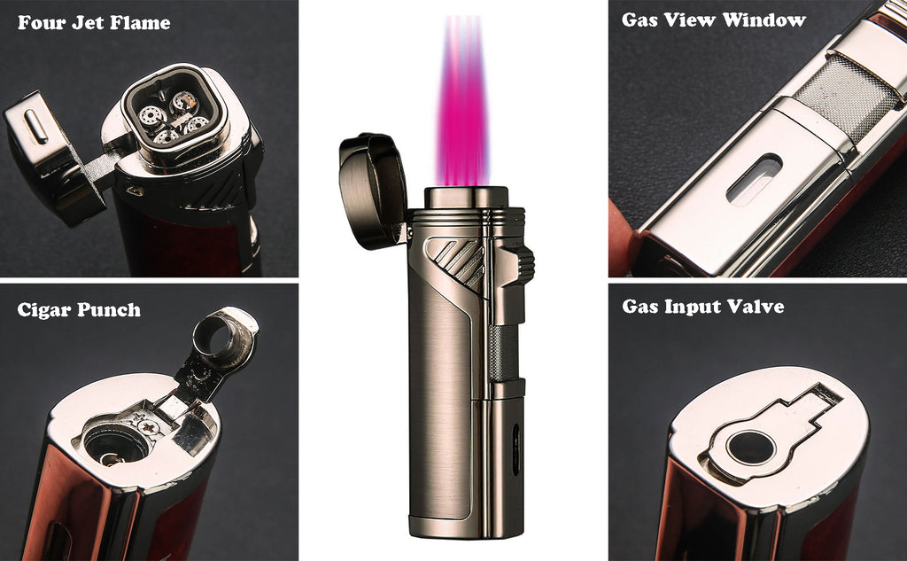 Quadruple 4 Jet Flame Cigar Lighter with Cigar Punch