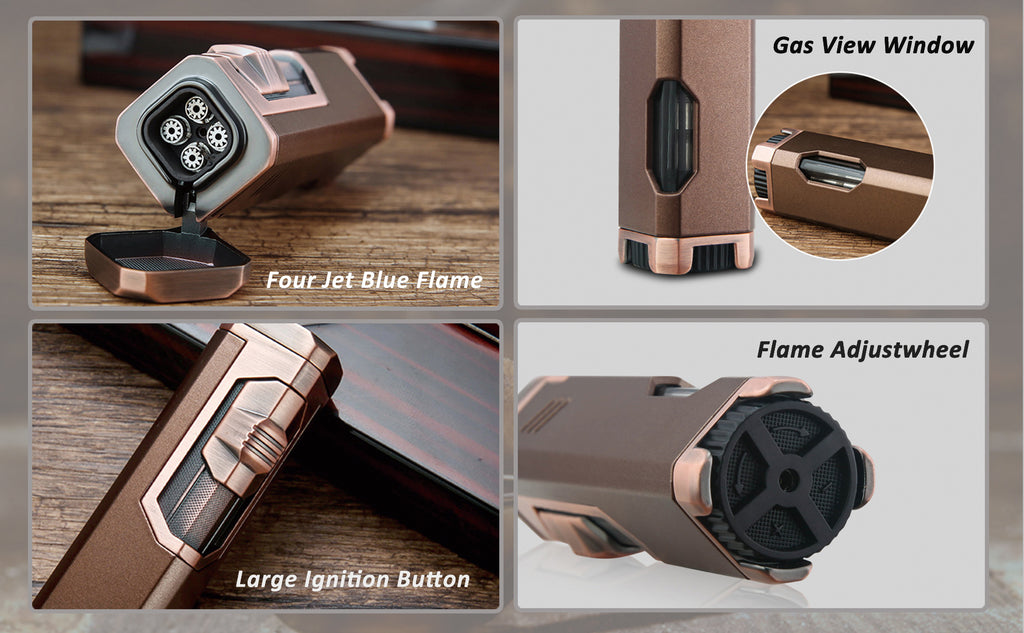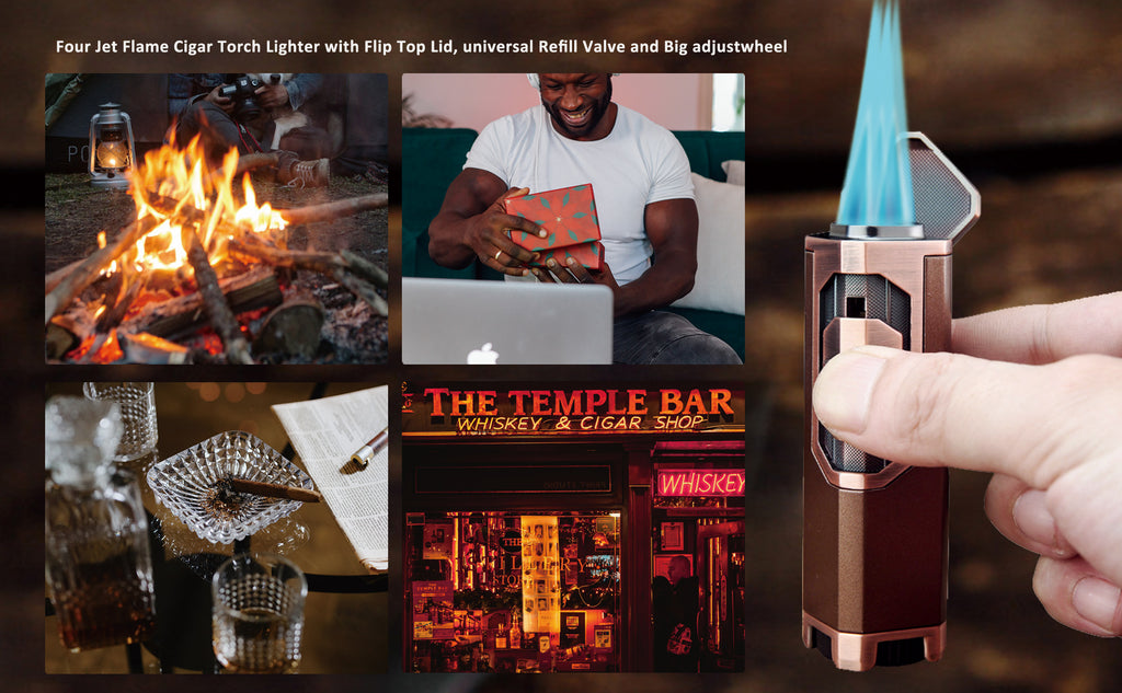- 🔥 Unique Red Flame Cigar Lighter : Strong 4 jets flame torch cigar lighter for any cigar sizes. windproof flames can evenly and quickly light your cigars, and inspire you a great release and a pleasure enjoyment.