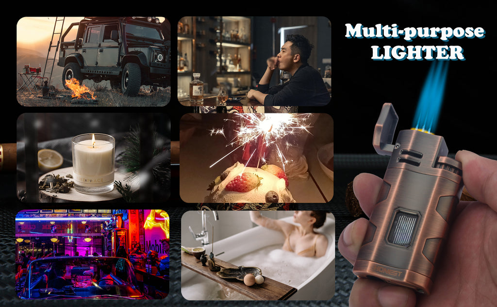 Size & Weight & Material  Lighter Size: 2.95x1.35x0.78inches Lighter Weight: 89g Material: Zinc alloy   Triple Jet Pocket Cigar Lighter 🔥 NOTE: FOR...